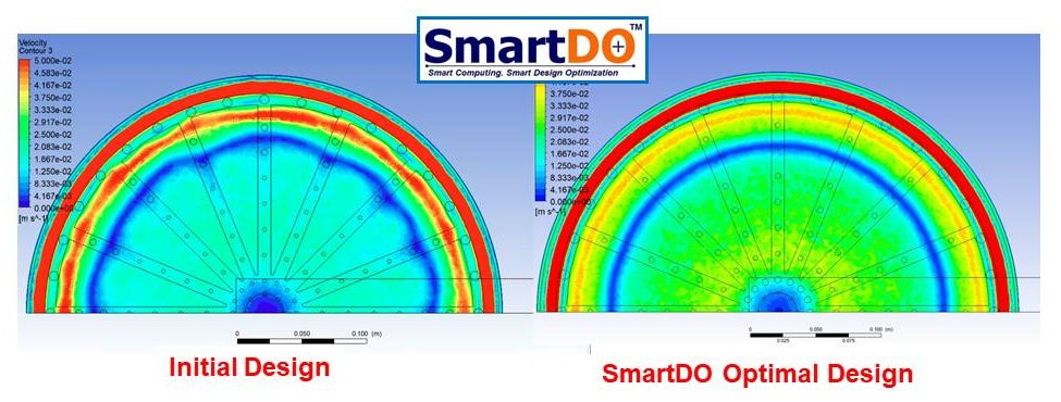 圖4顯示了流場速度大小分佈於初始設計(左)與SmartDO最佳化設計(右)之比較。